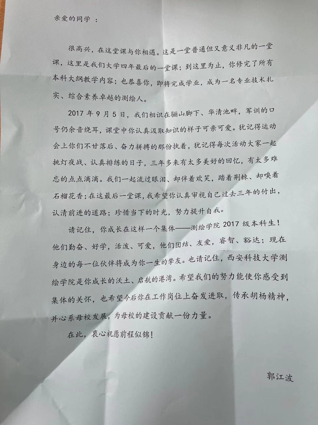 12月15日,2021届毕业生迎来大学四年的最后一堂课,毕业生辅导员郭江波为员工送去祝福,希望这份努力使同学们感受到集体的关怀,也希望即将离校的员工们今后在工作岗位上奋发进取,传承胡杨精神,心系母校发展,为母校的建设贡献一份力量。
