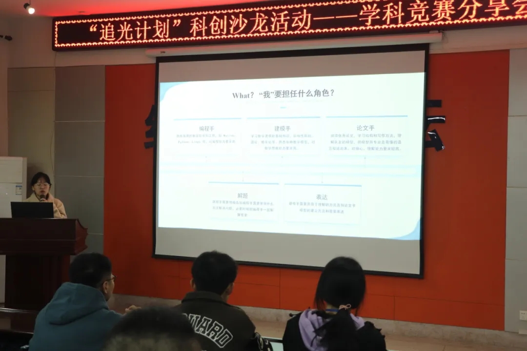 拓宽知识视野,增强学术底蕴。侯雨彤学姐从全国老员工数学建模竞赛和全国老员工英语竞赛两大赛事讲起,以“What”“Who”“How”为思路,对比赛介绍、队友选择、竞赛准备三方面提出了宝贵的建议。最后,她强调学科竞赛需要长期的知识积累和训练,她以“行百里者半九十”这句话提醒我们不要轻言放弃,坚持在学科竞赛之路上砥砺前行。