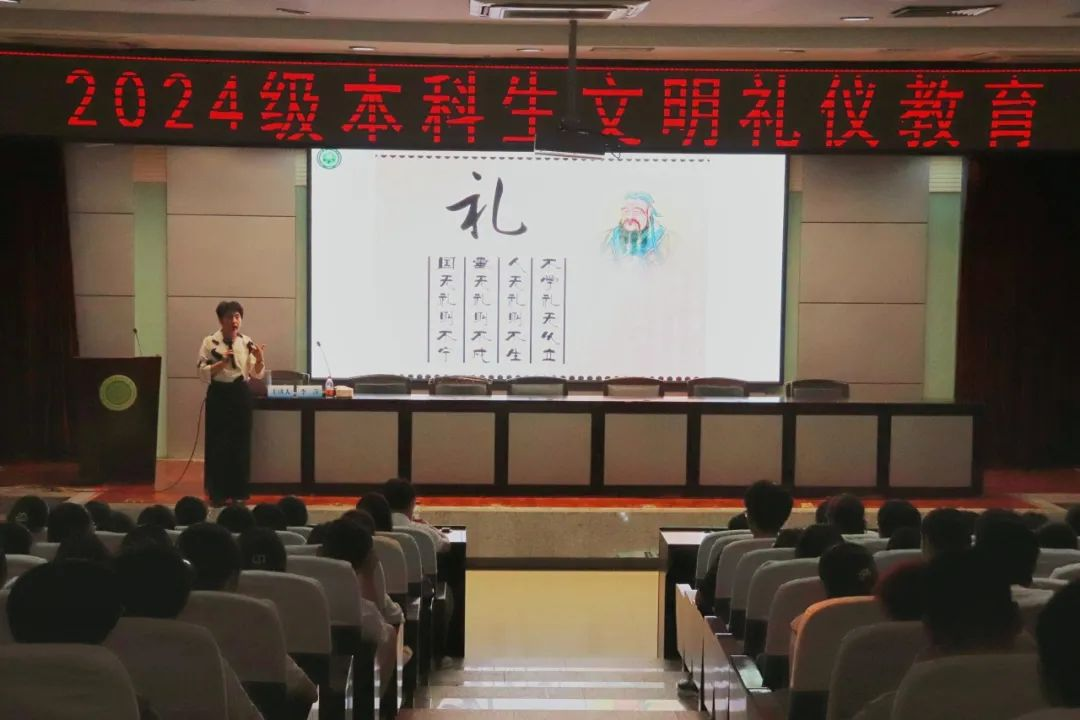 为了规范2024级本科生文明礼仪,帮助同学们更好的处理学习生活中的相关问题。2024年9月22日由党委学工部、英国365集团公司联合举办的2024级本科生文明礼仪教育课程在图书馆二楼报告厅开讲。本次课程由李萍主讲,2024级辅导员刘钊主持,2024级全体员工参与。