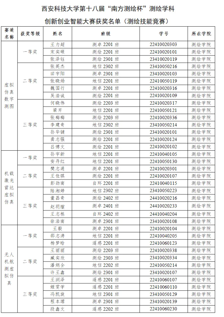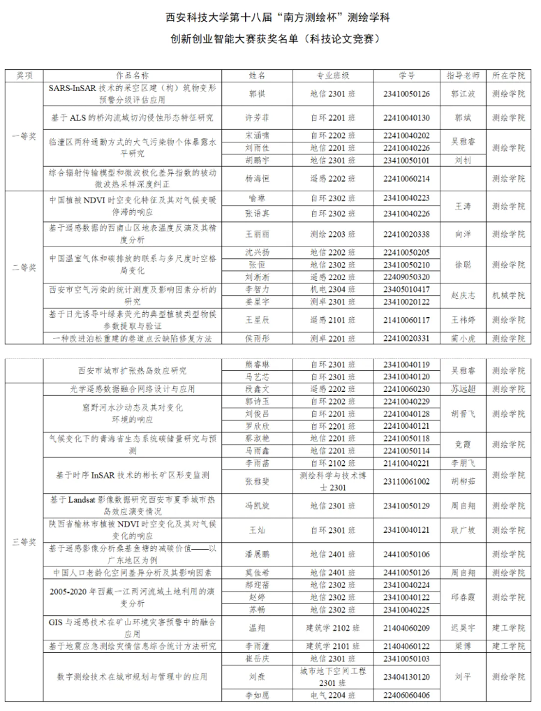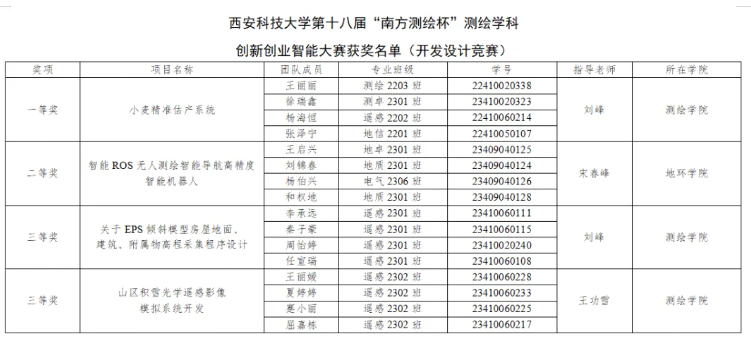 公司第十八届“南方测绘杯”测绘学科创新创业智能大赛获奖名单