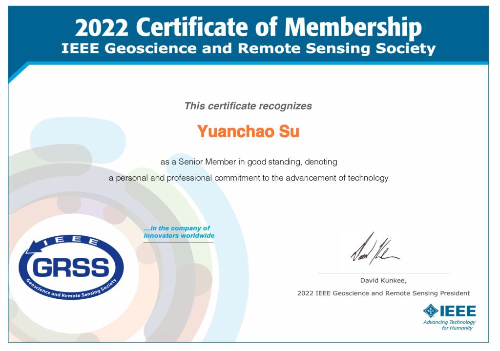 近五年来,苏远超老师作为国际地球科学与遥感学会(IEEE Geoscience and Remote Sensing Society)成员,主要从事高光谱遥感数据智能化信息提取方面研究工作,其研究领域涉及遥感图像处理、地物分析与识别、人工智能、机器学习和深度学习等。目前,苏老师以第一作者身份在人工智能和遥感领域的IEEE期刊或会议上发表学术论文12篇,同时也是目前IEEE旗下所有遥感领域权威SCI期刊的审稿人,与中科院空天院、中山大学、中国地质大学、西班牙埃斯特雷马杜拉大学、意大利帕维亚大学、美国田纳西大学等国内外研究机保持着密切的学术合作。此次当选为IEEE高级会员,是国际电气和电子工程师协会对其专业造诣以及在高光谱数据智能化信息提取方面所做贡献的肯定。