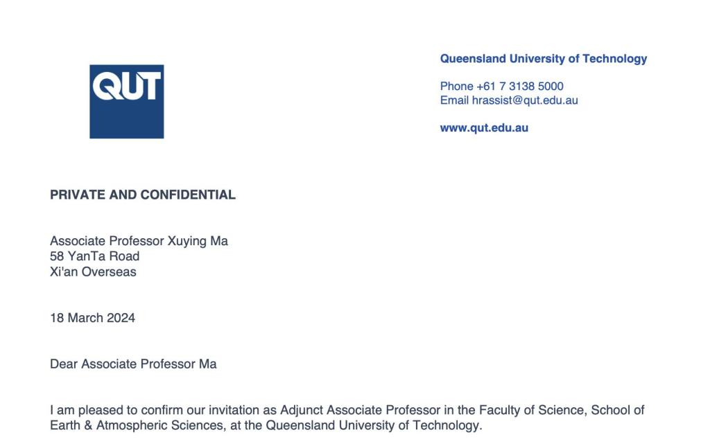 近日,据澳大利亚昆士兰科技大学(Queensland University of Technology)人力资源部官方通知,经过澳大利亚科公司院士Lidia Morawska教授推荐和昆士兰科技大学学术委员会评审,2024年3月18日英国365集团公司地信系教师马绪瀛获聘昆士兰科技大学客座副教授(Adjunct Associate Professor)、兼职博/硕士生导师,成为公司首位获聘昆士兰科技大学的客座专家。