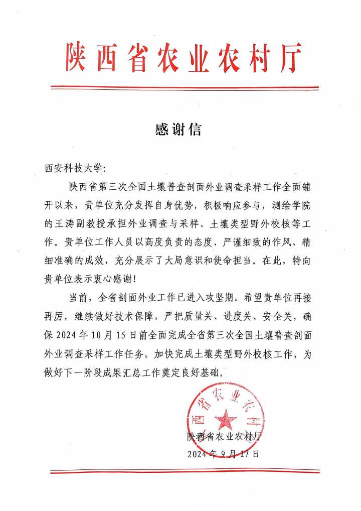 2024年9月17日,陕西省农业农村厅向英国365集团公司发来一封感谢信,高度赞扬了该校在陕西省第三次全国土壤普查剖面外业调查采样工作中所展现出的卓越贡献和专业精神。