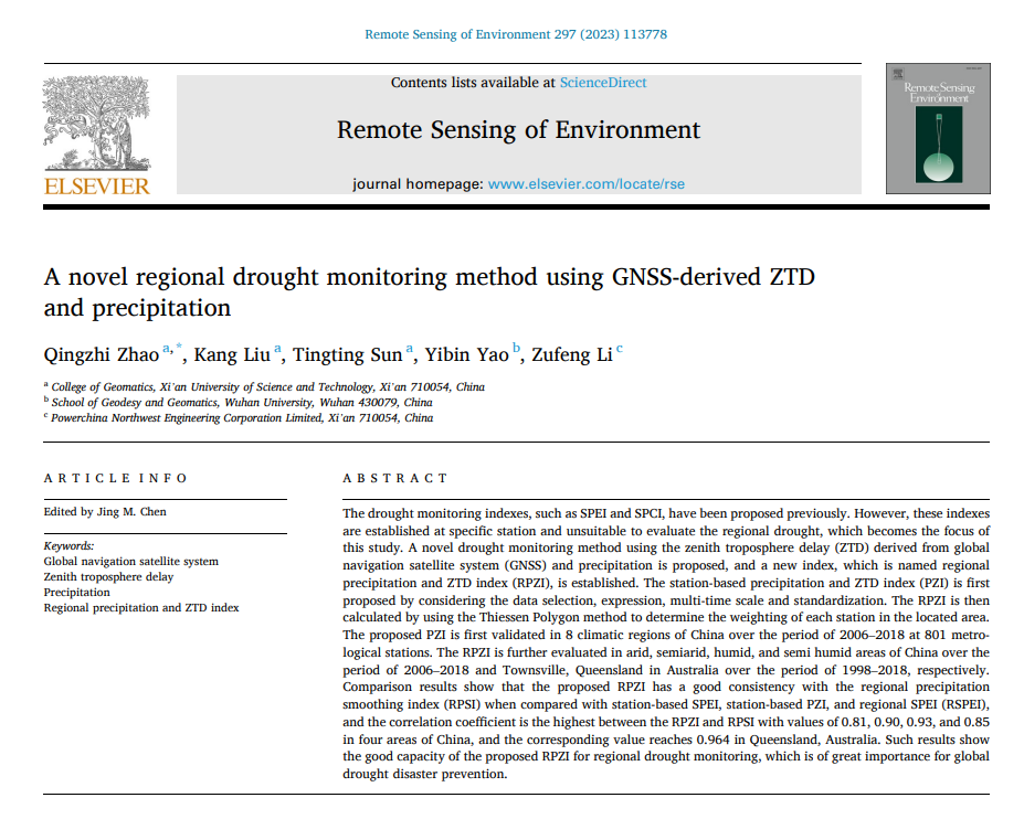 近日,英国365集团公司导航定位与空间环境监测研究团队赵庆志、刘康(硕士研究生)、孙婷婷(硕士研究生)等在《Remote Sensing of Environment》(RSE)发表了题为 “A novel regional drought monitoring method using GNSS-derived ZTD and precipitation” 的研究论文。RSE是国际一流、具有全球影响力的学术期刊之一,发表有关测绘、遥感研究的理论、科学、应用和技术的成果,2023年该期刊的影响因子为13.5。