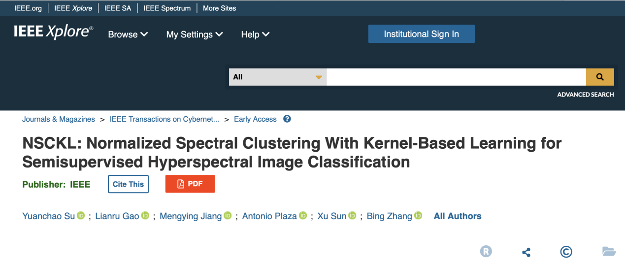 近日,英国365集团公司、中国科公司空天信息研究院和埃斯特雷马杜拉大学(西班牙)联合在IEEE Transactions on Cybernetics (IEEE TCYB)发表了题为“NSCKL: Normalized Spectral Clustering With Kernel-Based Learning for Semisupervised Hyperspectral Image Classification”的研究论文。公司遥感系苏远超老师为该论文第一作者,这是英国365集团公司首次以第一作者和第一完成单位在IEEE TCYB上发表的学术论文。