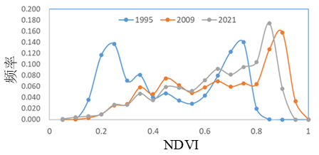 由图11可知,研究区近30年来植被状况明显向好。选择城市建设较为典型的延安新区,分析其NDVI变化,如图15所示,我们可以从图中看到延安新区建设的过程。自2009年至2021年,尽管延安新区逐步建设,但周边植被明显向好。1995年,该区域NDVI值集中分布于0.2左右,表明整体都是裸地。到2009年,地表植被覆盖增多,NDVI值增加,集中分布在大于0.5左右的区域。到2021年,区域内大部分像元的NDVI值都大于0.6。同样地,以0.6作为NDVI阈值,将NDVI>0.6的区域划分为植被地类,则1995年、2009年、2021年该区域植被覆盖率分别为31.6%、63.1%和75.7%。