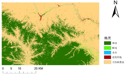 本案例采用支持向量机对研究区进行分类。支持向量机是一种监督分类方法,是一种根据已知类别的样本像元去识别其他未知类别像元的方法。监督分类的基本思想是:从研究区域选取具有代表性的训练样本,依据样本选择参与分类的特征变量,然后根据特征变量的统计特性建立判别函数,据此来识别非样本像元的归属类别。主要环节包括:训练样本的选择、监督分类、分类后评价。图13是分类结果。