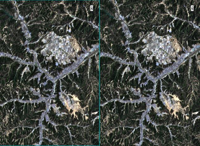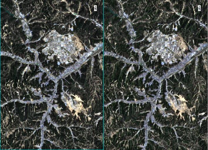 图 9 地形校正前后影像对比